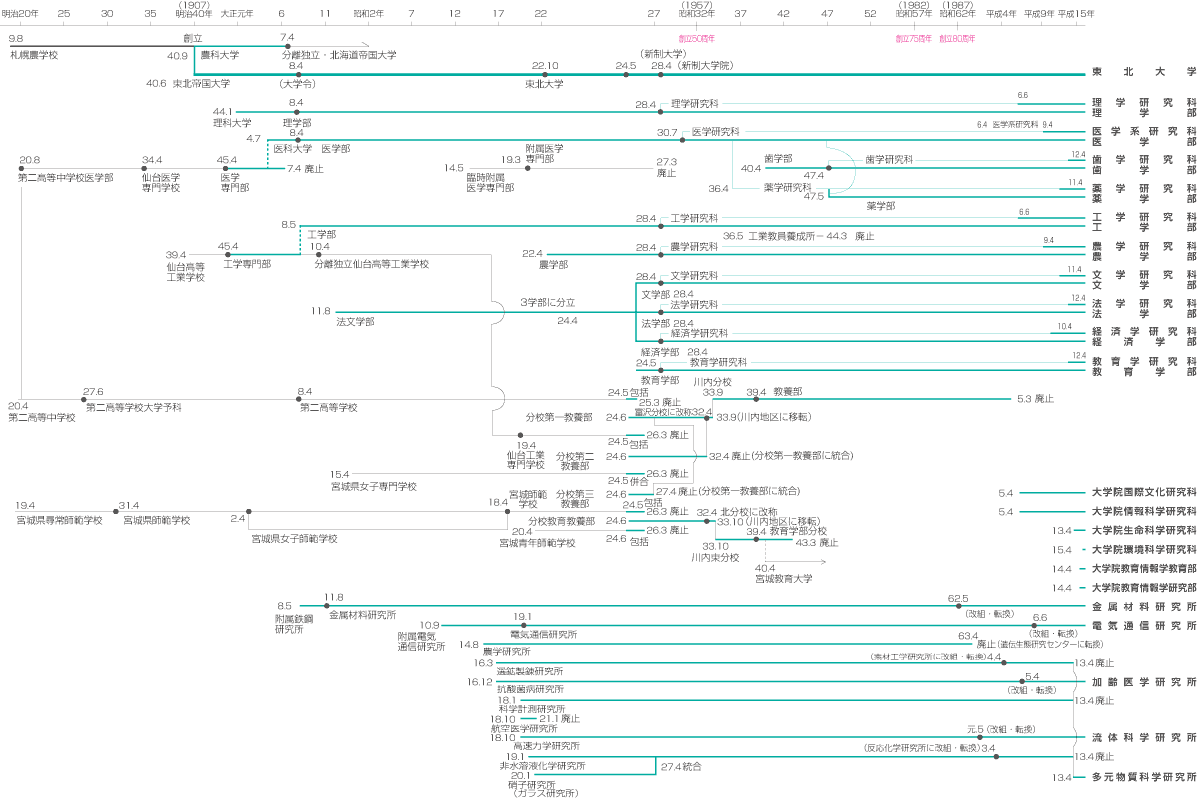 文学部・教育学部(設置)・法学部・経済学部・理学部・医学部・工学部・農学部 |